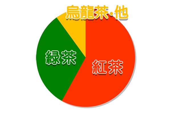 日本では、緑茶を飲む機会が多いですね。世界的にも、お茶の飲用習慣は緑茶から始まりました。ところが現在では、世界で1年に生産される約530万トンのお茶(カメリア・シネンシスから作られたもの)のうち、実に60%近くを紅茶が占めています。多くの国々で紅茶が親しまれていることがわかりますね。ちなみに緑茶は30%強、烏龍茶などその他のお茶はわずか数%の生産量しかありません。また、日本の生産量は約7.6万トンですが、これはほとんどを緑茶が占めています。