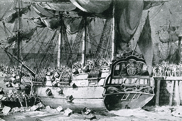 18世紀後半、イギリスの植民地だったアメリカでは、本国同様に茶の消費が増加していました。しかし政府が課した茶税への反発から不買運動と密輸が広がり、茶の独占輸入権を持っていた東インド会社は大量の在庫を抱えてしまいます。1773年、この在庫を安く販売するため東インド会社の関税を免除する「茶法(茶条例)」が制定されると、本国政府のでたらめな政策に反発した人々はボストンに入港した同社の船を襲い、積荷の茶を海に投げ捨ててしまうという事件を起こしました。これが世界史上有名な「ボストン・ティーパーティー事件」です。これがきっかけとなり、後にアメリカの独立戦争へと発展していきました。